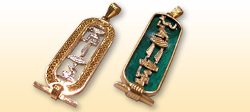 It was believed by placing a name inside the oval rope the Cartouche empowered and protected the Pharaoh. Cartouches come in many different shapes and designs: solid, filigree, circular, inlaid with gemstones, as pendants, also in cufflinks, bracelets, rings and key rings.